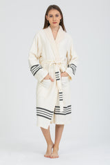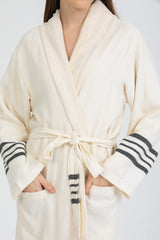 • Beli kuşaklı, cepli, pamuklu ve ekstra emici bornoz.