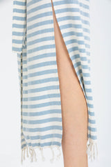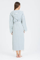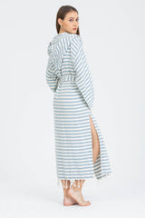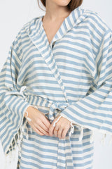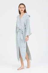 - Melisa Kapüşonlu Yırtmaçlı Kadın Bornozu Havacı Mavi %100 pamuktan Türkiye'de dokunmuştur.